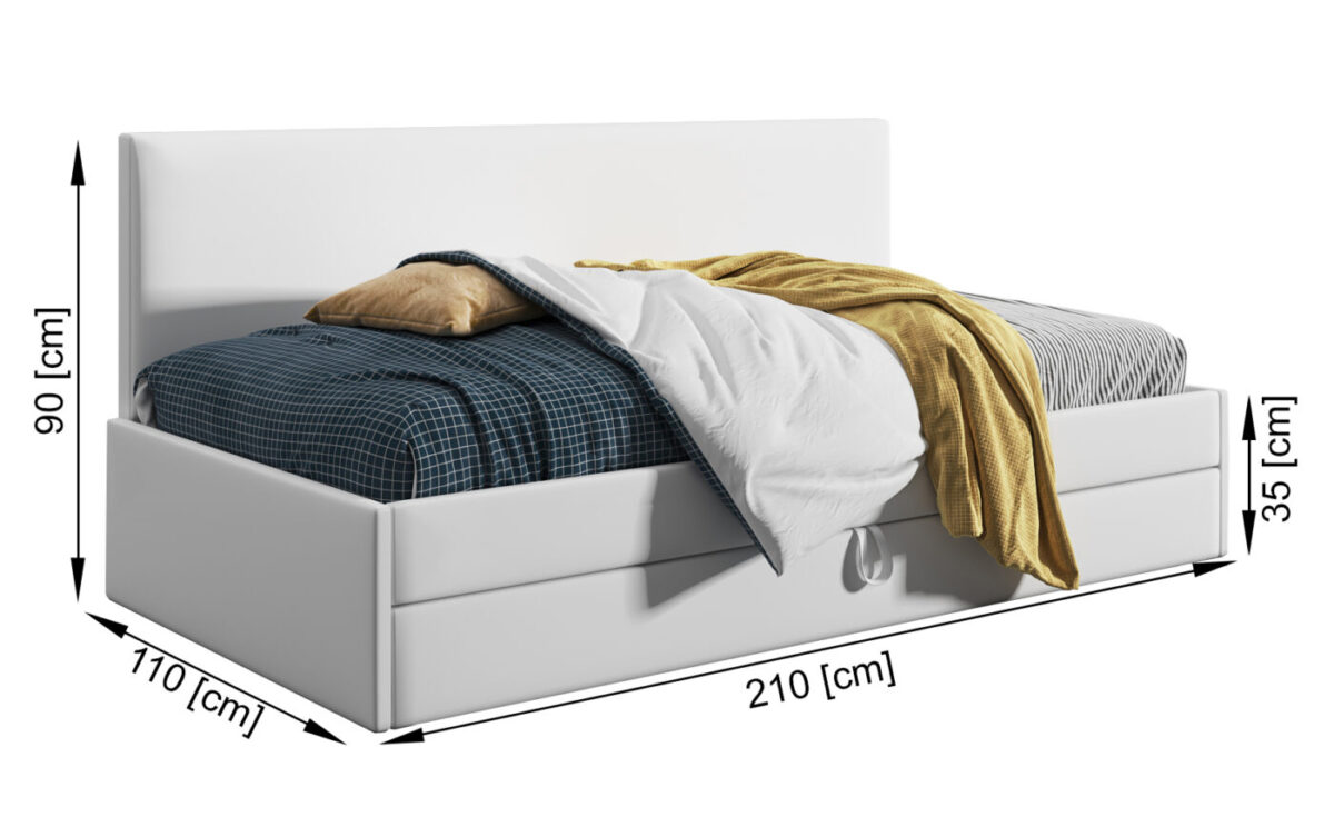 Szuflada jest idealnym rozwiązaniem w pomieszczeniach o ograniczonej przestrzeni lub ze skosami, gdzie zastosowanie pojemnika podnoszonego mogłoby być niewygodne. Łóżko z szufladą łączy nowoczesny design z codziennym komfortem – idealne dla młodzieży, gości lub dorosłych, którzy cenią funkcjonalność i estetykę w jednym meblu.