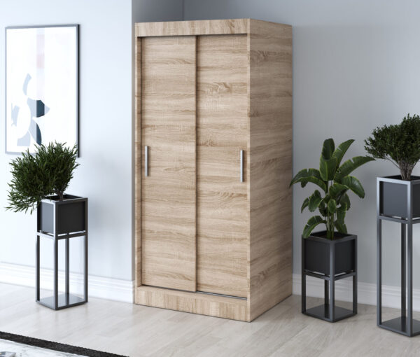Wyposażona w dwoje drzwi przesuwnych, szafa umożliwia swobodne korzystanie z wnętrza nawet w mniejszych pomieszczeniach. Pojemne wnętrze z półkami i drążkiem na ubrania pozwala w pełni wykorzystać przestrzeń, utrzymując porządek i harmonię w sypialni, garderobie czy przedpokoju.