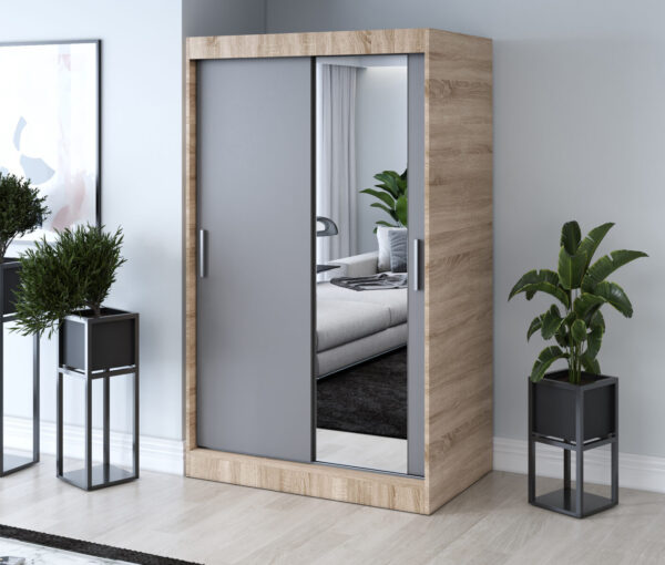 Wyposażona w dwoje drzwi przesuwnych, szafa umożliwia swobodne korzystanie z wnętrza nawet w mniejszych pomieszczeniach. Pojemne wnętrze z półkami i drążkiem na ubrania pozwala w pełni wykorzystać przestrzeń, utrzymując porządek i harmonię w sypialni, garderobie czy przedpokoju.