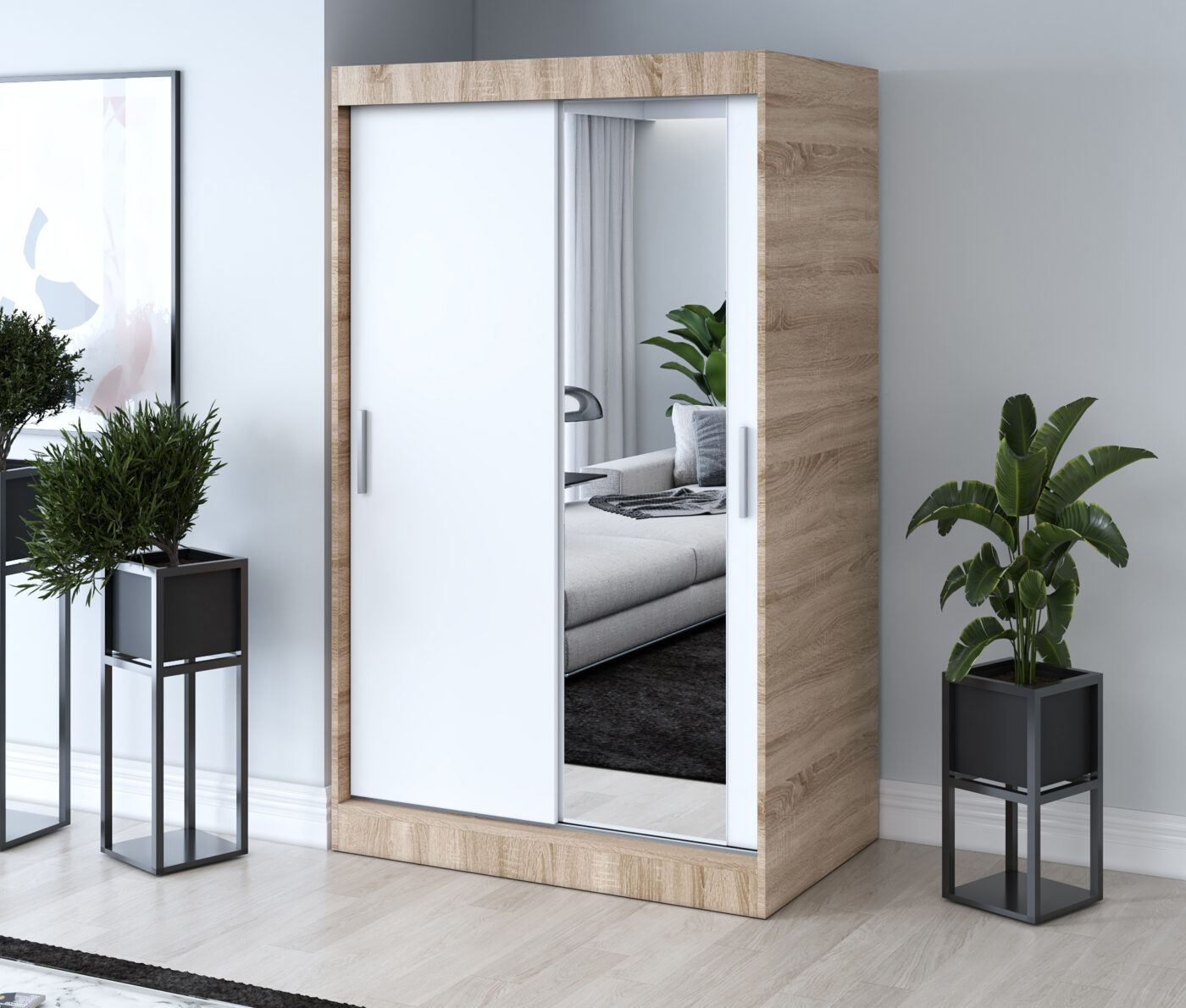 Lustro – klejone bezpośrednio na front szafy, z gładkimi i starannie wykończonymi krawędziami. Nadaje meblowi elegancki wygląd, optycznie powiększa przestrzeń i dodaje wnętrzu lekkości.