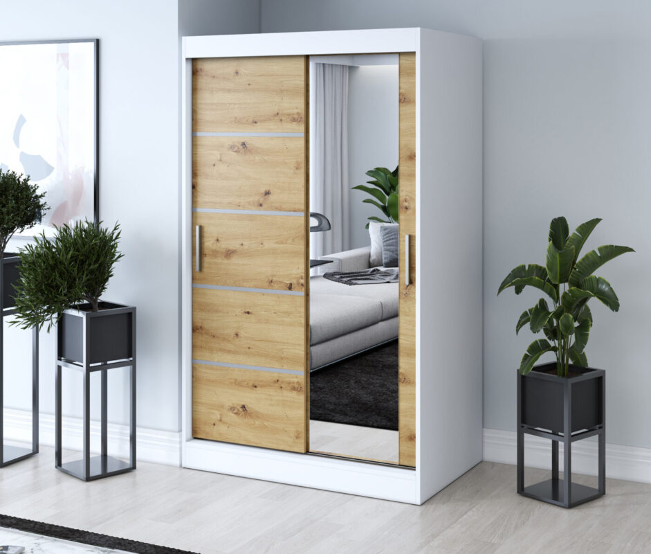Wyposażona w dwoje drzwi przesuwnych, szafa umożliwia swobodne korzystanie z wnętrza nawet w mniejszych pomieszczeniach. Pojemne wnętrze z półkami i drążkiem na ubrania pozwala w pełni wykorzystać przestrzeń, utrzymując porządek i harmonię w sypialni, garderobie czy przedpokoju.