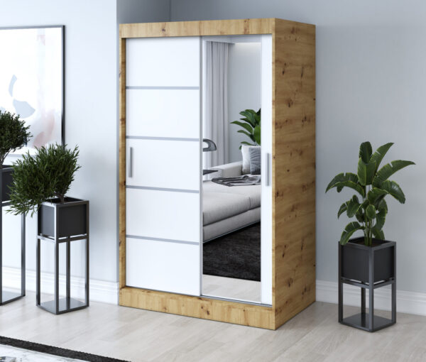 Wyposażona w dwoje drzwi przesuwnych, szafa umożliwia swobodne korzystanie z wnętrza nawet w mniejszych pomieszczeniach. Pojemne wnętrze z półkami i drążkiem na ubrania pozwala w pełni wykorzystać przestrzeń, utrzymując porządek i harmonię w sypialni, garderobie czy przedpokoju.