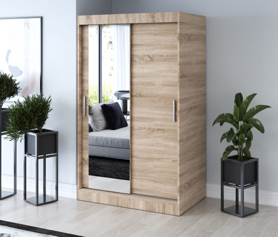Wyposażona w dwoje drzwi przesuwnych, szafa umożliwia swobodne korzystanie z wnętrza nawet w mniejszych pomieszczeniach. Pojemne wnętrze z półkami i drążkiem na ubrania pozwala w pełni wykorzystać przestrzeń, utrzymując porządek i harmonię w sypialni, garderobie czy przedpokoju.