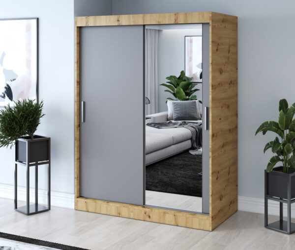 Wyposażona w dwoje drzwi przesuwnych, szafa umożliwia swobodne korzystanie z wnętrza nawet w mniejszych pomieszczeniach. Pojemne wnętrze z półkami i drążkiem na ubrania pozwala w pełni wykorzystać przestrzeń, utrzymując porządek i harmonię w sypialni, garderobie czy przedpokoju.