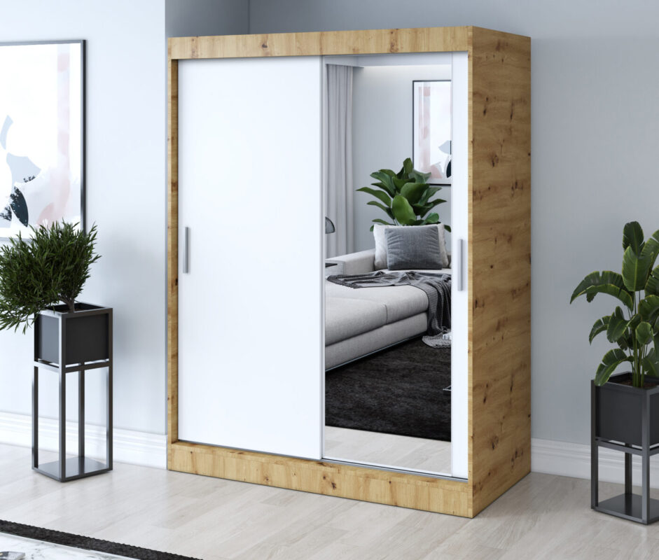 Wyposażona w dwoje drzwi przesuwnych, szafa umożliwia swobodne korzystanie z wnętrza nawet w mniejszych pomieszczeniach. Pojemne wnętrze z półkami i drążkiem na ubrania pozwala w pełni wykorzystać przestrzeń, utrzymując porządek i harmonię w sypialni, garderobie czy przedpokoju.