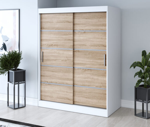 Wyposażona w dwoje drzwi przesuwnych, szafa umożliwia swobodne korzystanie z wnętrza nawet w mniejszych pomieszczeniach. Pojemne wnętrze z półkami i drążkiem na ubrania pozwala w pełni wykorzystać przestrzeń, utrzymując porządek i harmonię w sypialni, garderobie czy przedpokoju.