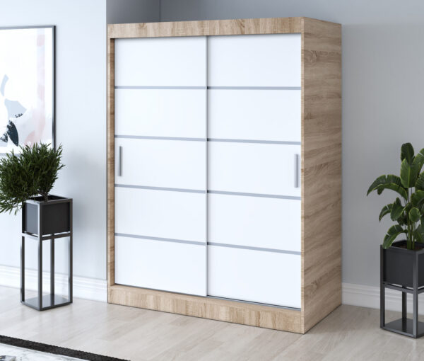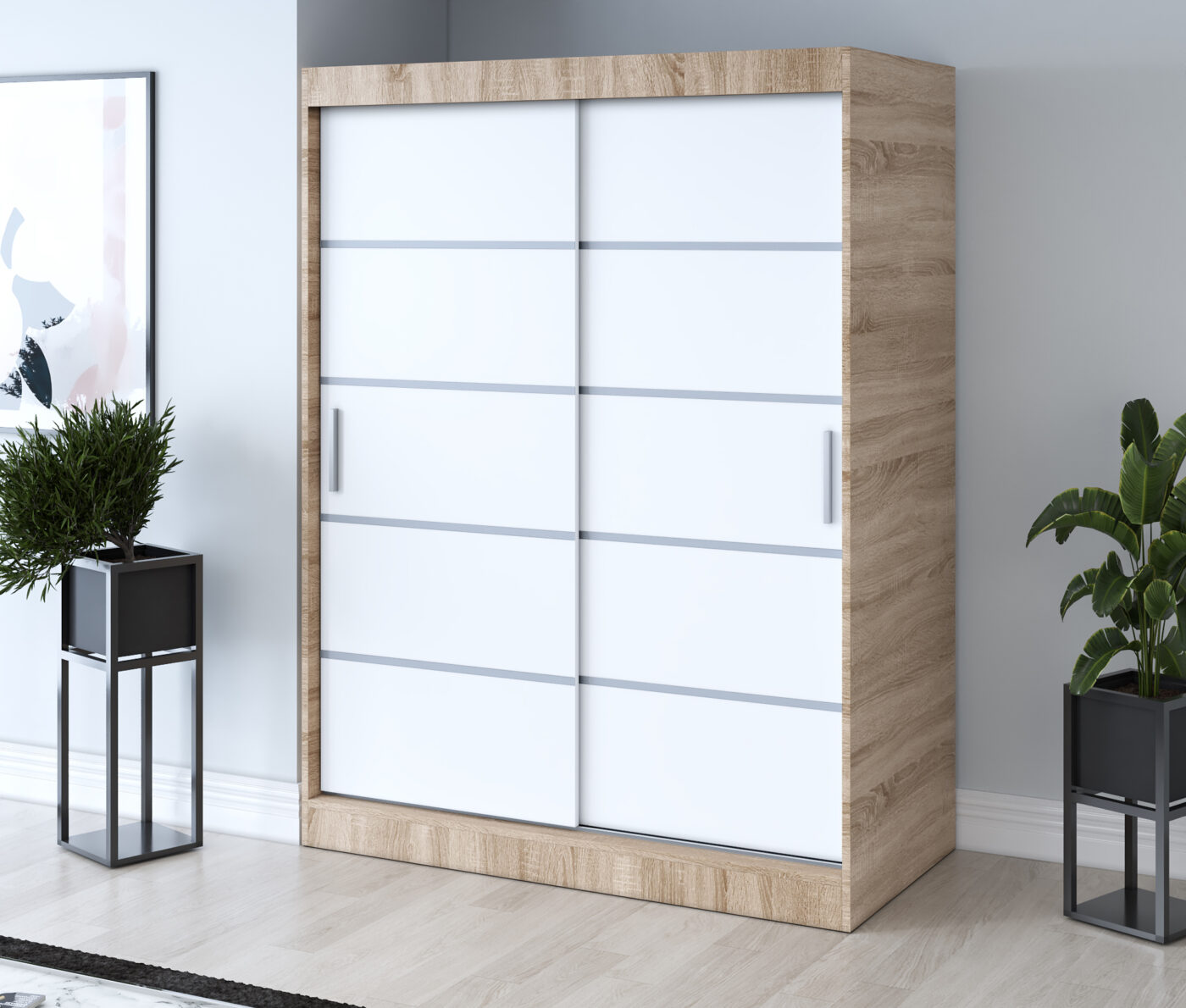 Wyposażona w dwoje drzwi przesuwnych, szafa umożliwia swobodne korzystanie z wnętrza nawet w mniejszych pomieszczeniach. Pojemne wnętrze z półkami i drążkiem na ubrania pozwala w pełni wykorzystać przestrzeń, utrzymując porządek i harmonię w sypialni, garderobie czy przedpokoju.