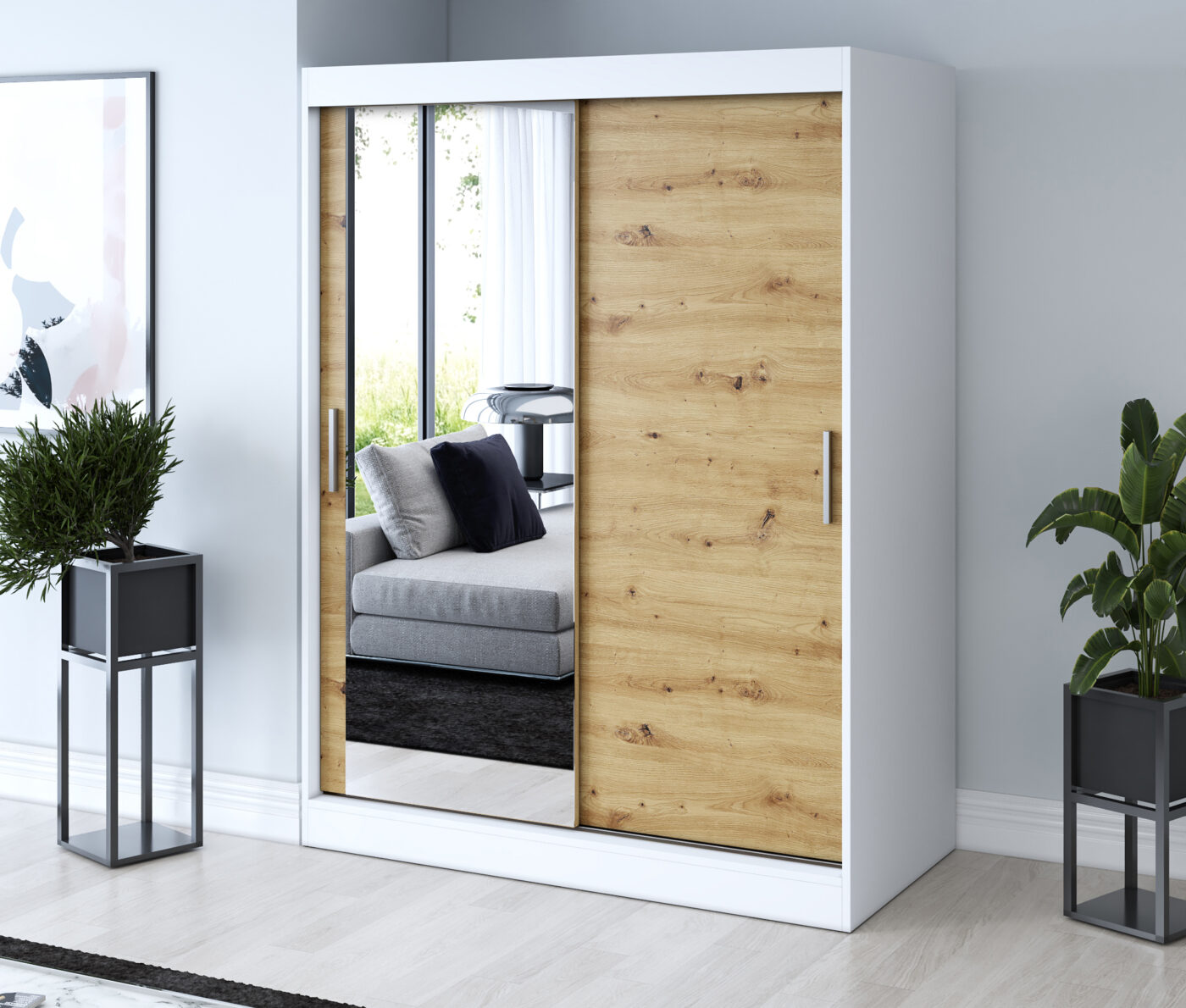 Wyposażona w dwoje drzwi przesuwnych, szafa umożliwia swobodne korzystanie z wnętrza nawet w mniejszych pomieszczeniach. Pojemne wnętrze z półkami i drążkiem na ubrania pozwala w pełni wykorzystać przestrzeń, utrzymując porządek i harmonię w sypialni, garderobie czy przedpokoju.