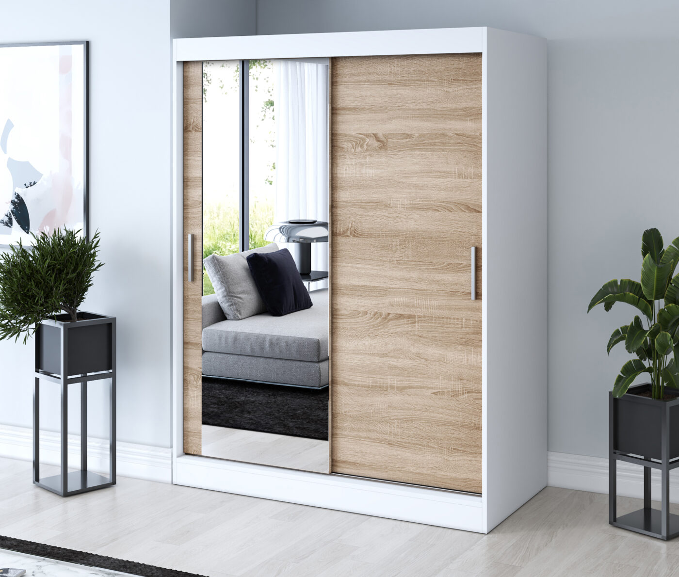 Wyposażona w dwoje drzwi przesuwnych, szafa umożliwia swobodne korzystanie z wnętrza nawet w mniejszych pomieszczeniach. Pojemne wnętrze z półkami i drążkiem na ubrania pozwala w pełni wykorzystać przestrzeń, utrzymując porządek i harmonię w sypialni, garderobie czy przedpokoju.