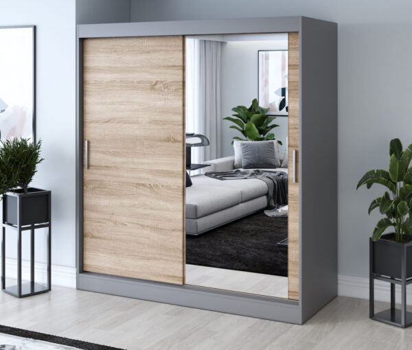 Wyposażona w dwoje drzwi przesuwnych, szafa umożliwia swobodne korzystanie z wnętrza nawet w mniejszych pomieszczeniach. Pojemne wnętrze z półkami i drążkiem na ubrania pozwala w pełni wykorzystać przestrzeń, utrzymując porządek i harmonię w sypialni, garderobie czy przedpokoju.