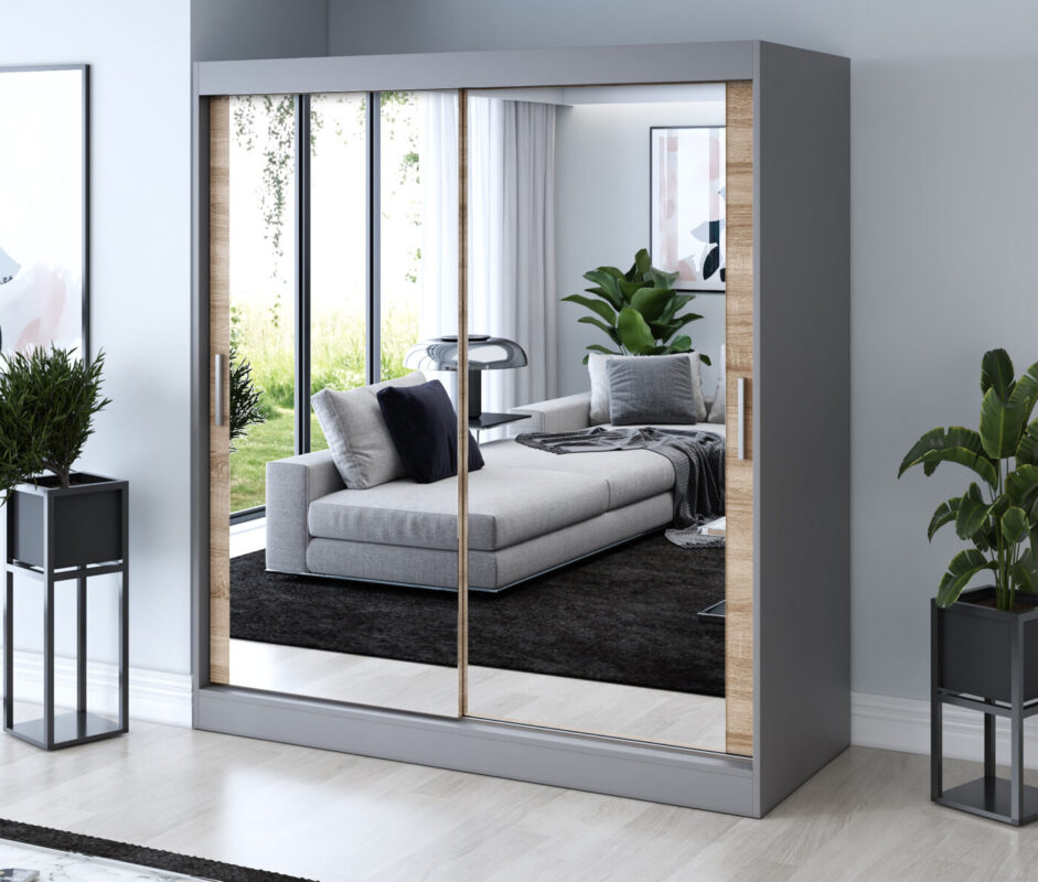 Lustro – klejone bezpośrednio na front szafy, z gładkimi i starannie wykończonymi krawędziami. Nadaje meblowi elegancki wygląd, optycznie powiększa przestrzeń i dodaje wnętrzu lekkości.