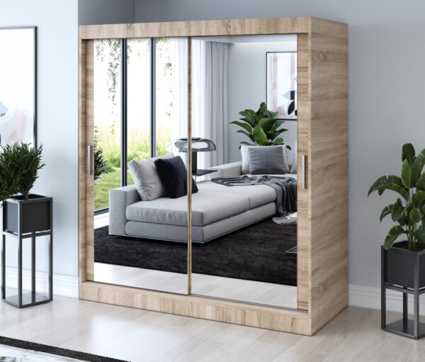 Wyposażona w dwoje drzwi przesuwnych, szafa umożliwia swobodne korzystanie z wnętrza nawet w mniejszych pomieszczeniach. Pojemne wnętrze z półkami i drążkiem na ubrania pozwala w pełni wykorzystać przestrzeń, utrzymując porządek i harmonię w sypialni, garderobie czy przedpokoju.