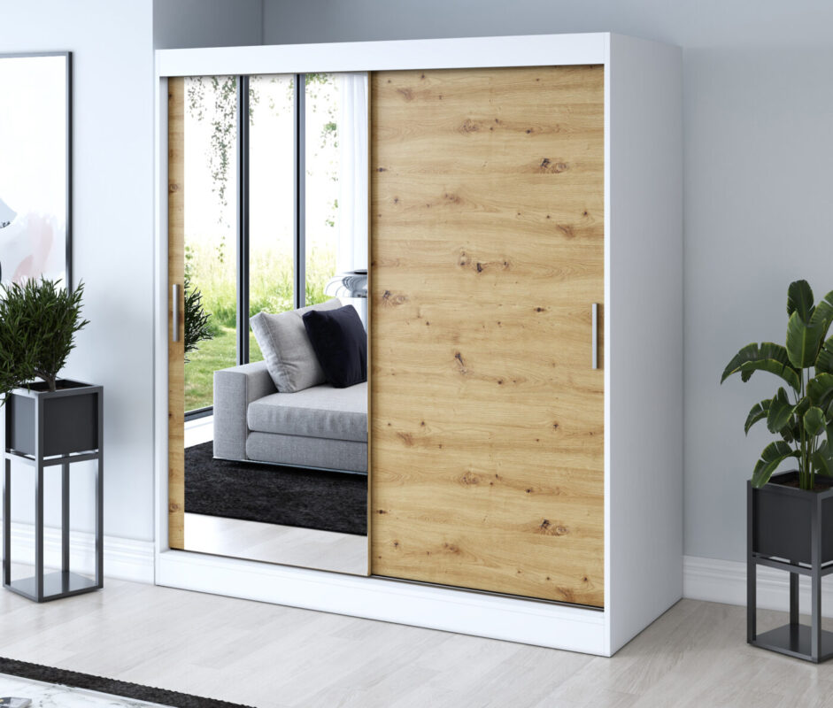 Wyposażona w dwoje drzwi przesuwnych, szafa umożliwia swobodne korzystanie z wnętrza nawet w mniejszych pomieszczeniach. Pojemne wnętrze z półkami i drążkiem na ubrania pozwala w pełni wykorzystać przestrzeń, utrzymując porządek i harmonię w sypialni, garderobie czy przedpokoju.