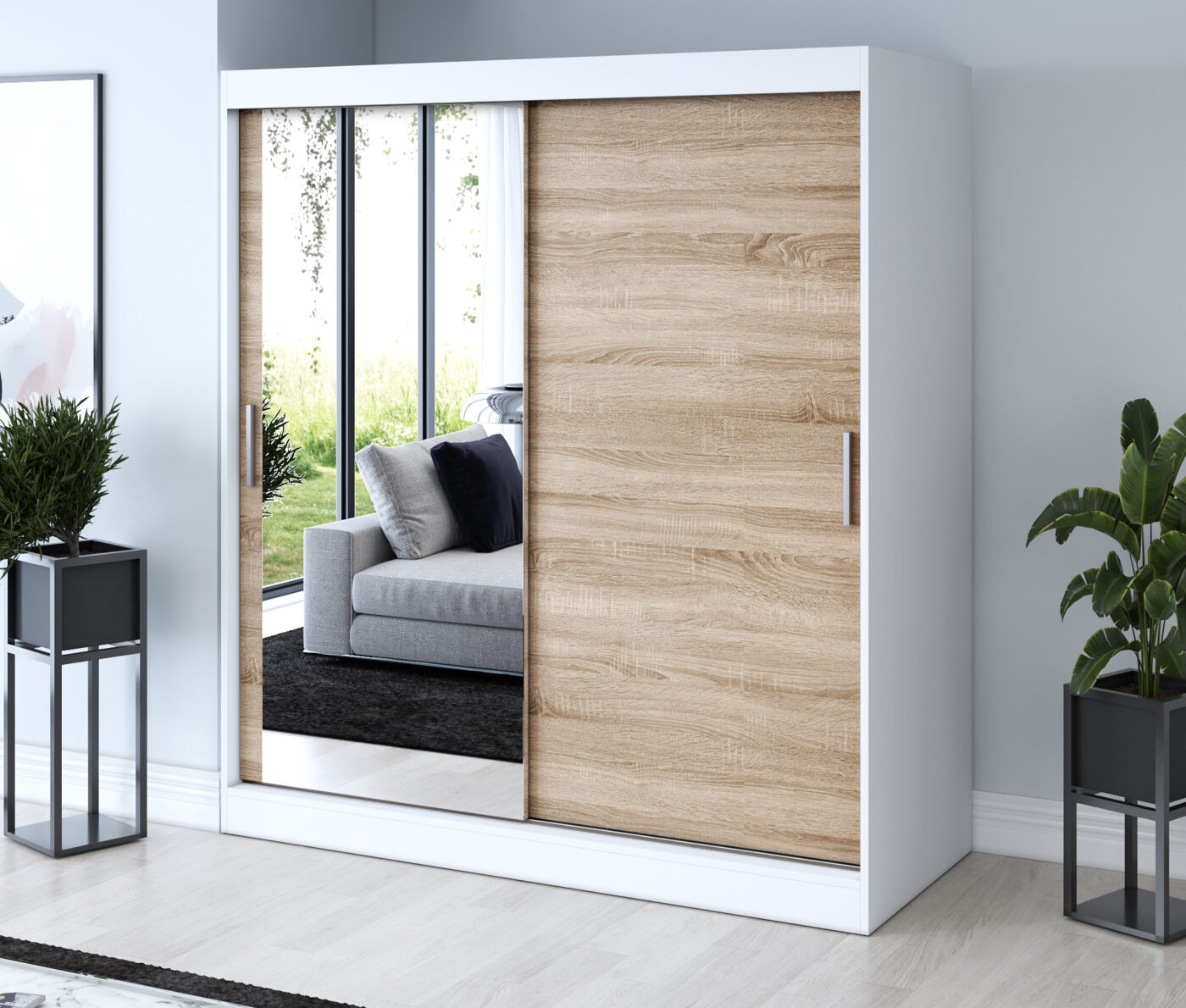 Wyposażona w dwoje drzwi przesuwnych, szafa umożliwia swobodne korzystanie z wnętrza nawet w mniejszych pomieszczeniach. Pojemne wnętrze z półkami i drążkiem na ubrania pozwala w pełni wykorzystać przestrzeń, utrzymując porządek i harmonię w sypialni, garderobie czy przedpokoju.