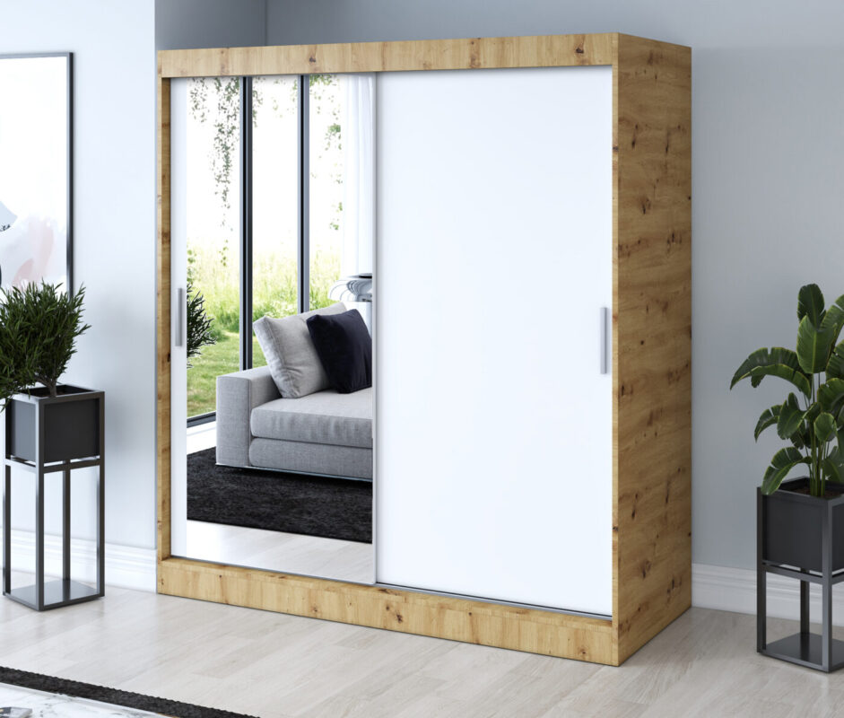 Wyposażona w dwoje drzwi przesuwnych, szafa umożliwia swobodne korzystanie z wnętrza nawet w mniejszych pomieszczeniach. Pojemne wnętrze z półkami i drążkiem na ubrania pozwala w pełni wykorzystać przestrzeń, utrzymując porządek i harmonię w sypialni, garderobie czy przedpokoju.