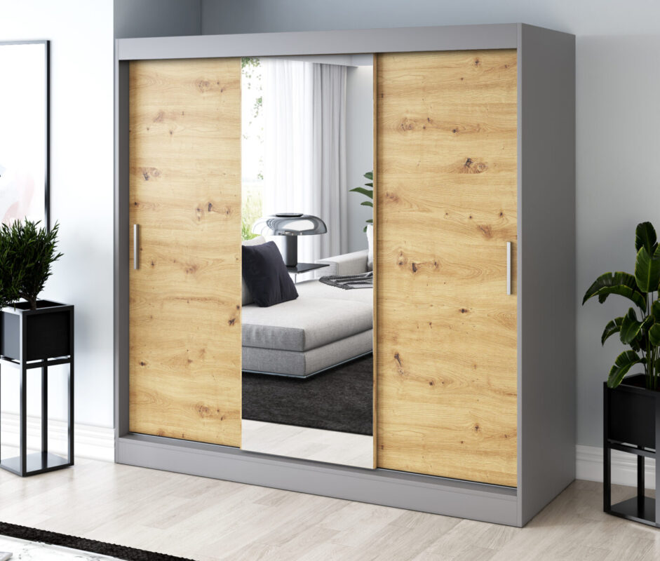 Nasza szafa przesuwna 200x200 cm to doskonały wybór dla osób, które cenią funkcjonalność, porządek i nowoczesny design. Jej trzydrzwiowa konstrukcja łączy elegancję z wygodą użytkowania. Przesuwne fronty otwierają dostęp do obszernego wnętrza, nie zajmując dodatkowego miejsca w pomieszczeniu.