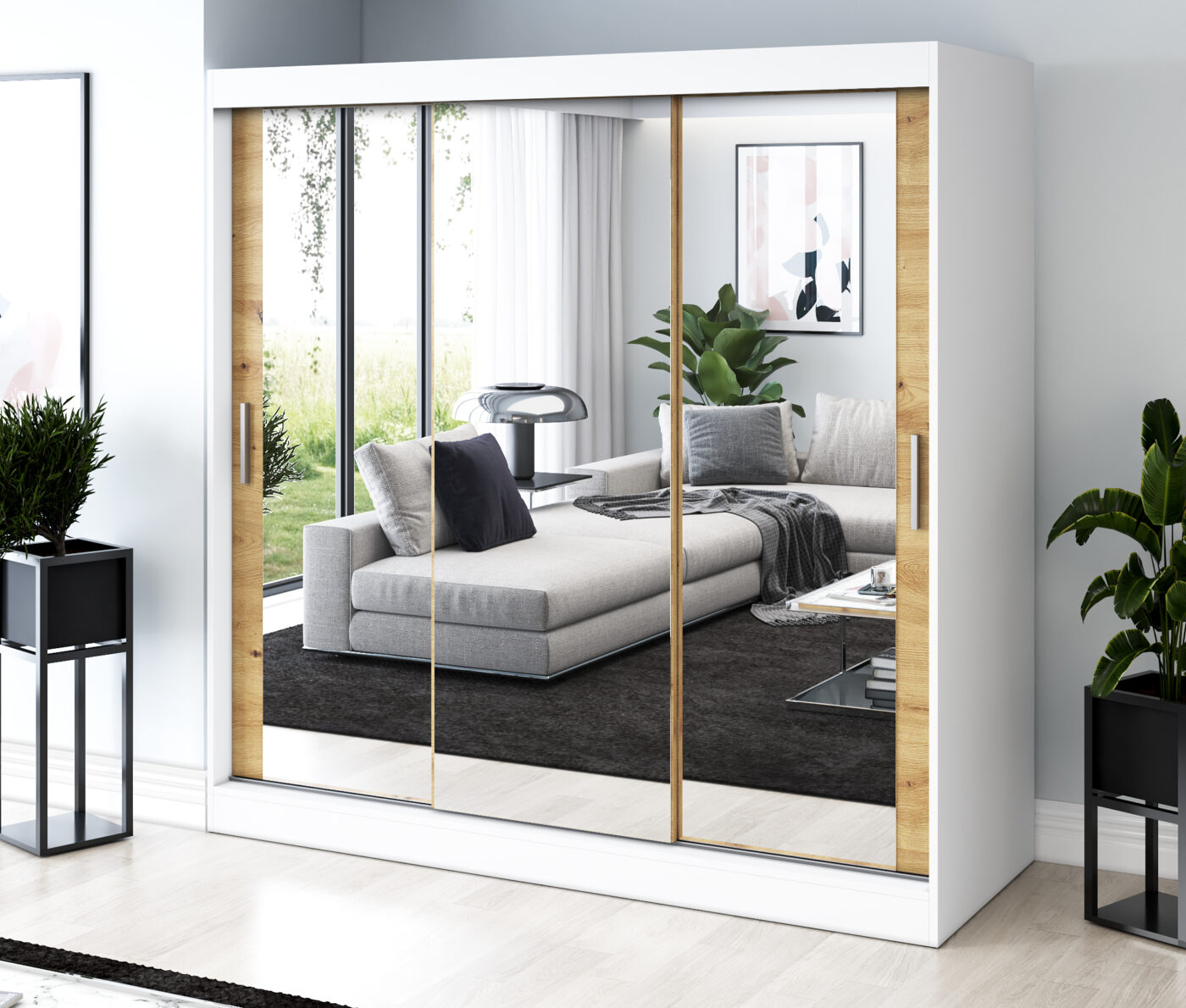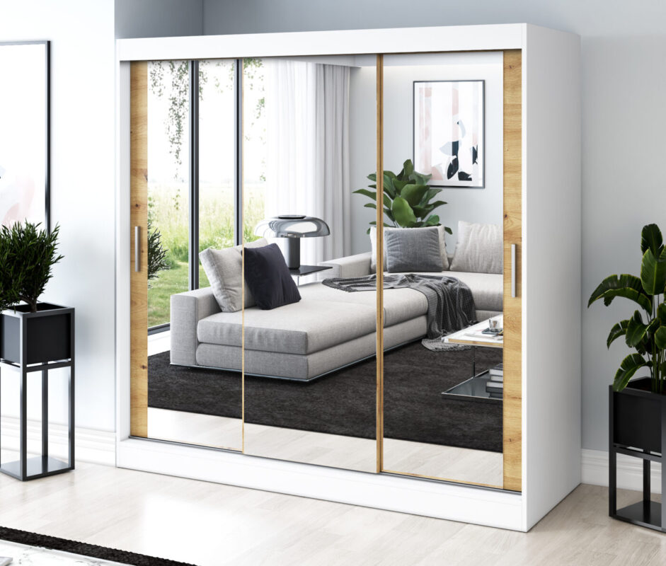 Nasza szafa przesuwna 200x200 cm to doskonały wybór dla osób, które cenią funkcjonalność, porządek i nowoczesny design. Jej trzydrzwiowa konstrukcja łączy elegancję z wygodą użytkowania. Przesuwne fronty otwierają dostęp do obszernego wnętrza, nie zajmując dodatkowego miejsca w pomieszczeniu.