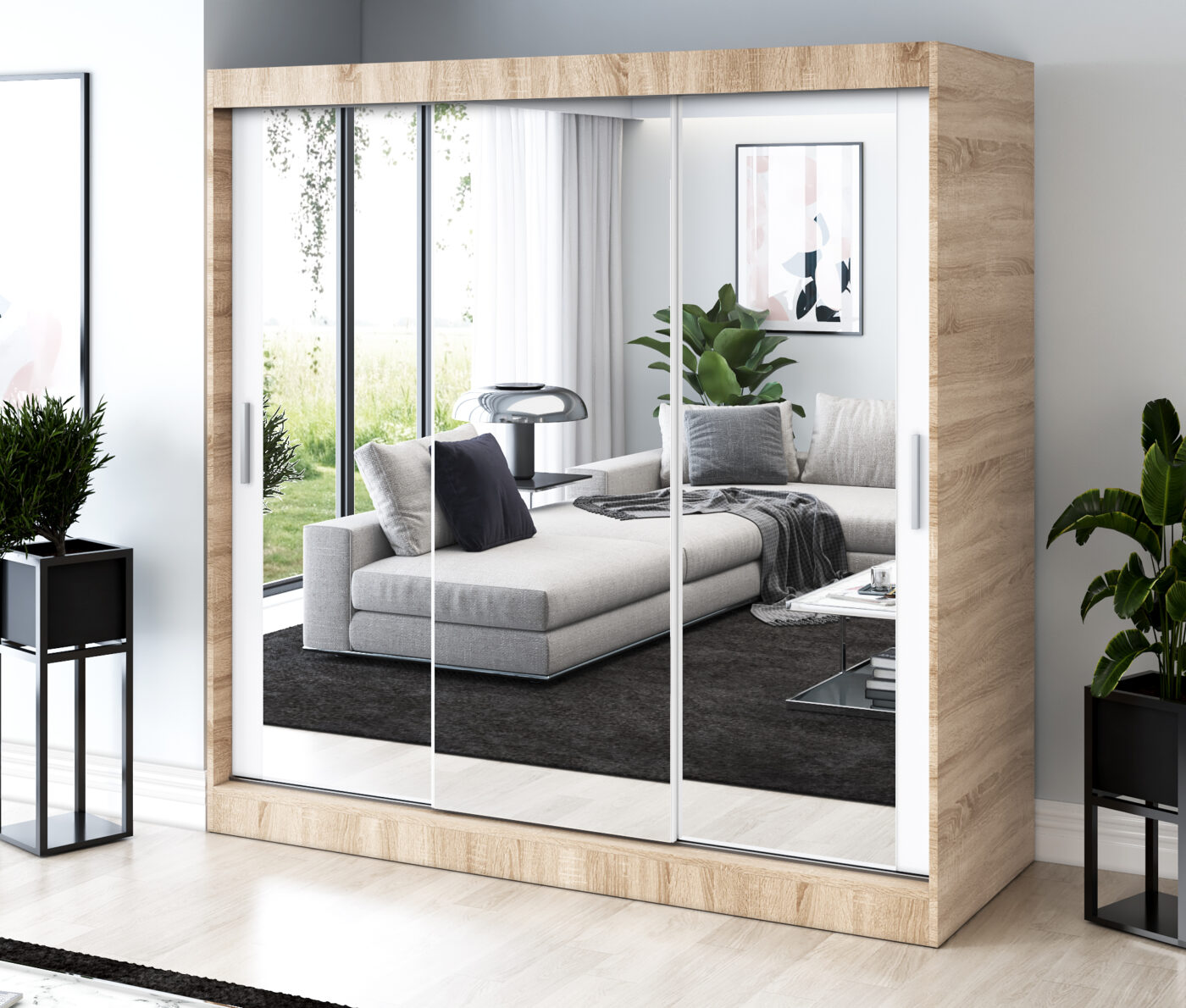 Nasza szafa przesuwna 200x200 cm to doskonały wybór dla osób, które cenią funkcjonalność, porządek i nowoczesny design. Jej trzydrzwiowa konstrukcja łączy elegancję z wygodą użytkowania. Przesuwne fronty otwierają dostęp do obszernego wnętrza, nie zajmując dodatkowego miejsca w pomieszczeniu.