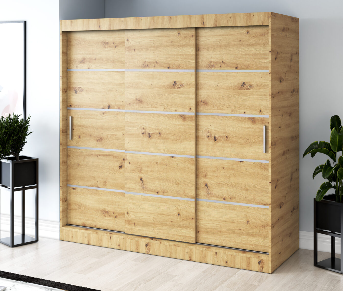 Nasza szafa przesuwna 200x200 cm to doskonały wybór dla osób, które cenią funkcjonalność, porządek i nowoczesny design. Jej trzydrzwiowa konstrukcja łączy elegancję z wygodą użytkowania. Przesuwne fronty otwierają dostęp do obszernego wnętrza, nie zajmując dodatkowego miejsca w pomieszczeniu.