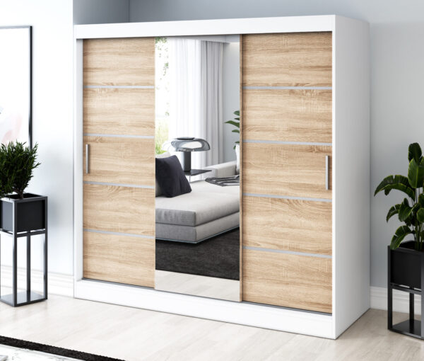 Nasza szafa przesuwna 200x200 cm to doskonały wybór dla osób, które cenią funkcjonalność, porządek i nowoczesny design. Jej trzydrzwiowa konstrukcja łączy elegancję z wygodą użytkowania. Przesuwne fronty otwierają dostęp do obszernego wnętrza, nie zajmując dodatkowego miejsca w pomieszczeniu.