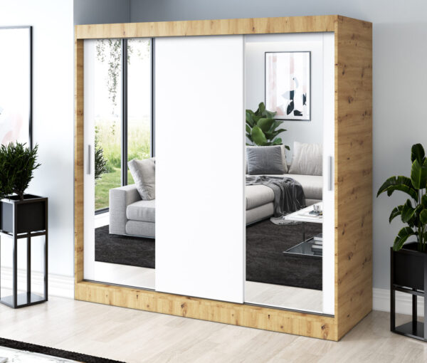 Nasza szafa przesuwna 200x200 cm to doskonały wybór dla osób, które cenią funkcjonalność, porządek i nowoczesny design. Jej trzydrzwiowa konstrukcja łączy elegancję z wygodą użytkowania. Przesuwne fronty otwierają dostęp do obszernego wnętrza, nie zajmując dodatkowego miejsca w pomieszczeniu.