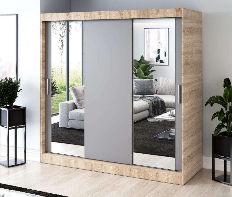 Nasza szafa przesuwna 200x200 cm to doskonały wybór dla osób, które cenią funkcjonalność, porządek i nowoczesny design. Jej trzydrzwiowa konstrukcja łączy elegancję z wygodą użytkowania. Przesuwne fronty otwierają dostęp do obszernego wnętrza, nie zajmując dodatkowego miejsca w pomieszczeniu.