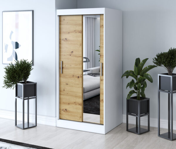 Wyposażona w dwoje drzwi przesuwnych, szafa umożliwia swobodne korzystanie z wnętrza nawet w mniejszych pomieszczeniach. Pojemne wnętrze z półkami i drążkiem na ubrania pozwala w pełni wykorzystać przestrzeń, utrzymując porządek i harmonię w sypialni, garderobie czy przedpokoju.