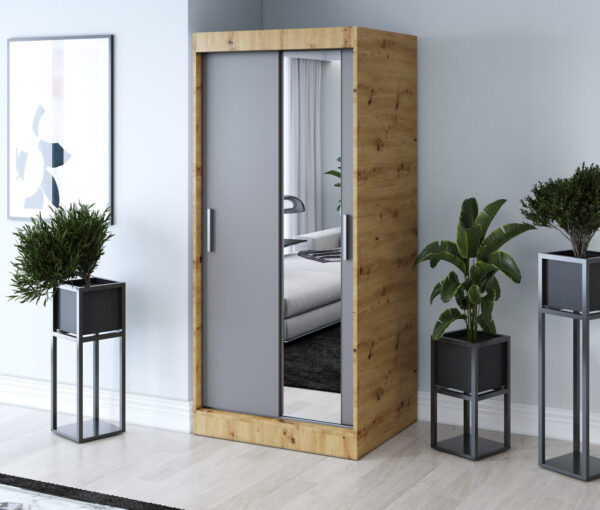 Wyposażona w dwoje drzwi przesuwnych, szafa umożliwia swobodne korzystanie z wnętrza nawet w mniejszych pomieszczeniach. Pojemne wnętrze z półkami i drążkiem na ubrania pozwala w pełni wykorzystać przestrzeń, utrzymując porządek i harmonię w sypialni, garderobie czy przedpokoju.