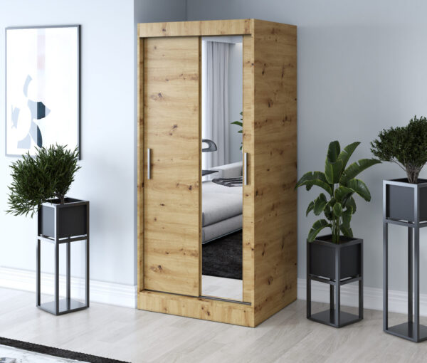 Wyposażona w dwoje drzwi przesuwnych, szafa umożliwia swobodne korzystanie z wnętrza nawet w mniejszych pomieszczeniach. Pojemne wnętrze z półkami i drążkiem na ubrania pozwala w pełni wykorzystać przestrzeń, utrzymując porządek i harmonię w sypialni, garderobie czy przedpokoju.