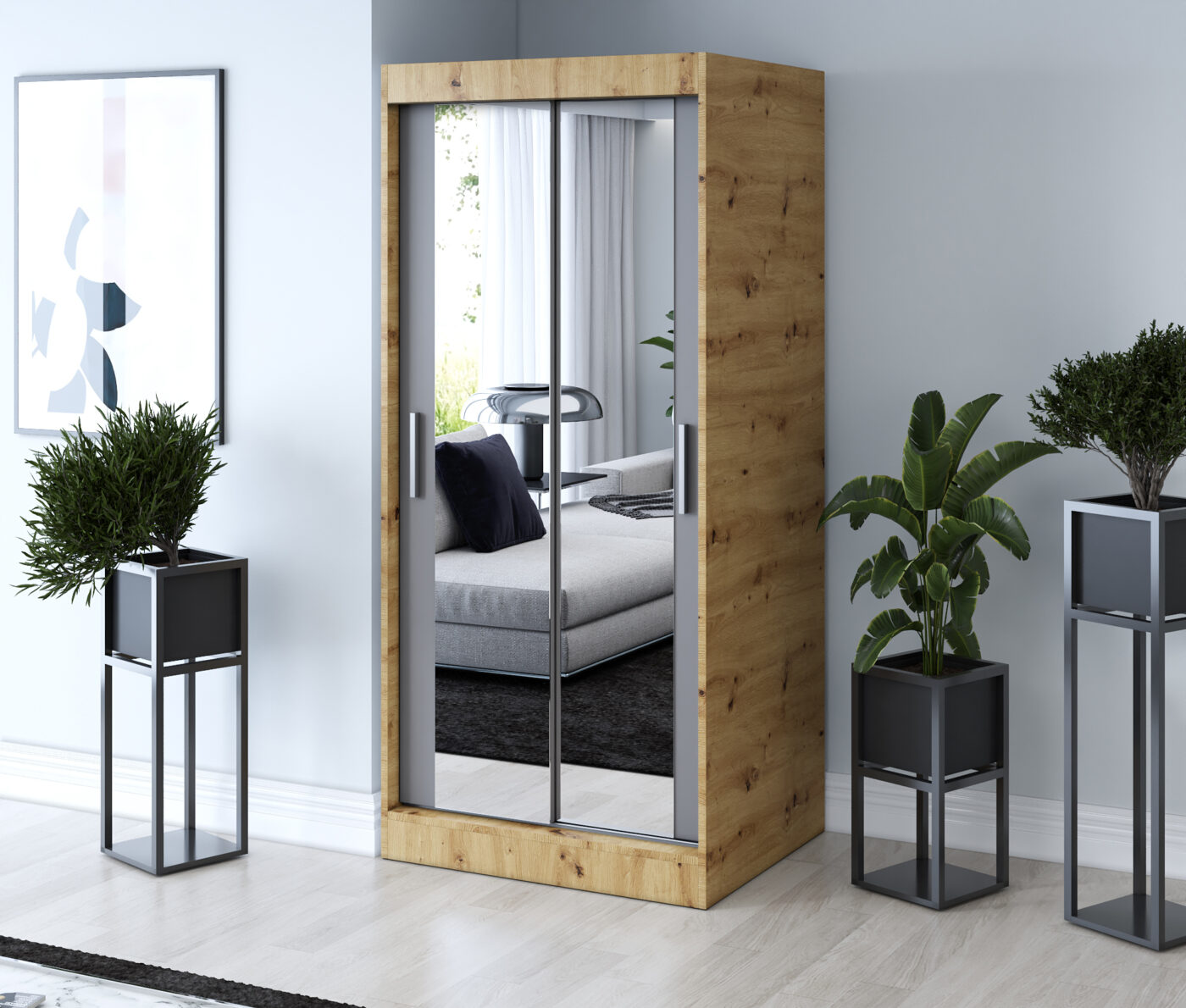 Wyposażona w dwoje drzwi przesuwnych, szafa umożliwia swobodne korzystanie z wnętrza nawet w mniejszych pomieszczeniach. Pojemne wnętrze z półkami i drążkiem na ubrania pozwala w pełni wykorzystać przestrzeń, utrzymując porządek i harmonię w sypialni, garderobie czy przedpokoju.