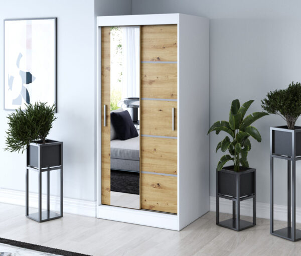 Wyposażona w dwoje drzwi przesuwnych, szafa umożliwia swobodne korzystanie z wnętrza nawet w mniejszych pomieszczeniach. Pojemne wnętrze z półkami i drążkiem na ubrania pozwala w pełni wykorzystać przestrzeń, utrzymując porządek i harmonię w sypialni, garderobie czy przedpokoju.
