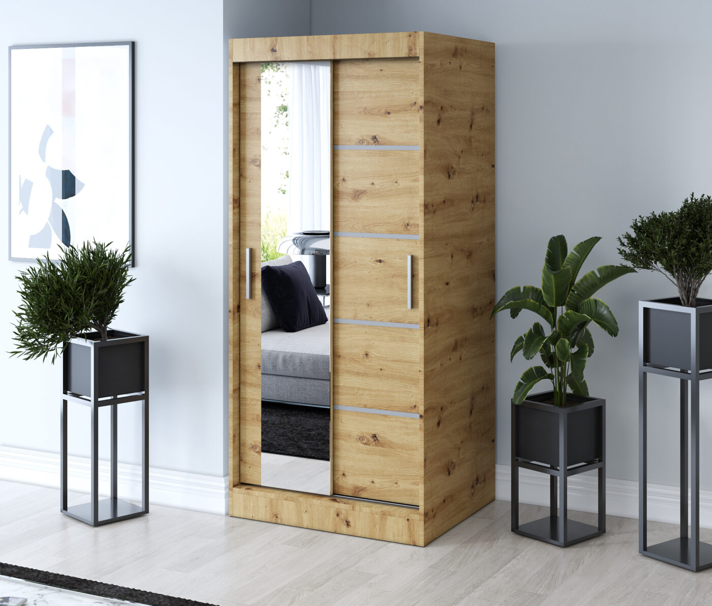Wyposażona w dwoje drzwi przesuwnych, szafa umożliwia swobodne korzystanie z wnętrza nawet w mniejszych pomieszczeniach. Pojemne wnętrze z półkami i drążkiem na ubrania pozwala w pełni wykorzystać przestrzeń, utrzymując porządek i harmonię w sypialni, garderobie czy przedpokoju.