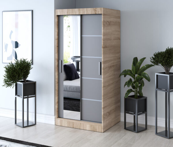 Wyposażona w dwoje drzwi przesuwnych, szafa umożliwia swobodne korzystanie z wnętrza nawet w mniejszych pomieszczeniach. Pojemne wnętrze z półkami i drążkiem na ubrania pozwala w pełni wykorzystać przestrzeń, utrzymując porządek i harmonię w sypialni, garderobie czy przedpokoju.